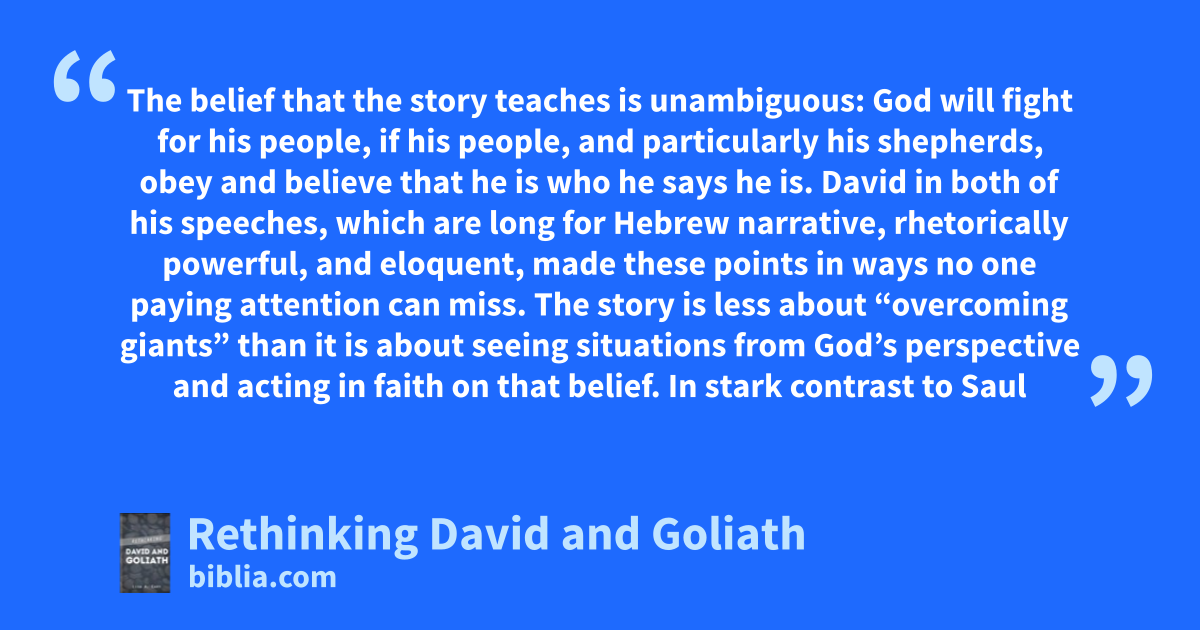 The belief that the story teaches is unambiguous: God will fight for his people, if his people, and particularly his shepherds, obey and believe that he is who he says he is. David in both of his speeches, which are long for Hebrew narrative, rhetorically powerful, and eloquent, made these points in ways no one paying attention can miss. The story is less about “overcoming giants” than it is about seeing situations from God’s perspective and acting in faith on that belief. In stark contrast to Saul