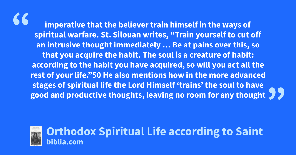 imperative that the believer train himself in the ways of spiritual warfare. St. Silouan writes, “Train yourself to cut off an intrusive thought immediately … Be at pains over this, so that you acquire the habit. The soul is a creature of habit: according to the habit you have acquired, so will you act all the rest of your life.”50 He also mentions how in the more advanced stages of spiritual life the Lord Himself ‘trains’ the soul to have good and productive thoughts, leaving no room for any thought