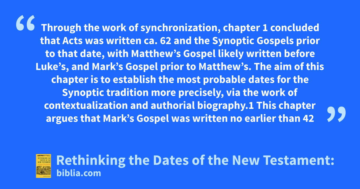 Through the work of synchronization, chapter 1 concluded that Acts was written ca. 62 and the Synoptic Gospels prior to that date, with Matthew’s Gospel likely written before Luke’s, and Mark’s Gospel prior to Matthew’s. The aim of this chapter is to establish the most probable dates for the Synoptic tradition more precisely, via the work of contextualization and authorial biography.1 This chapter argues that Mark’s Gospel was written no earlier than 42