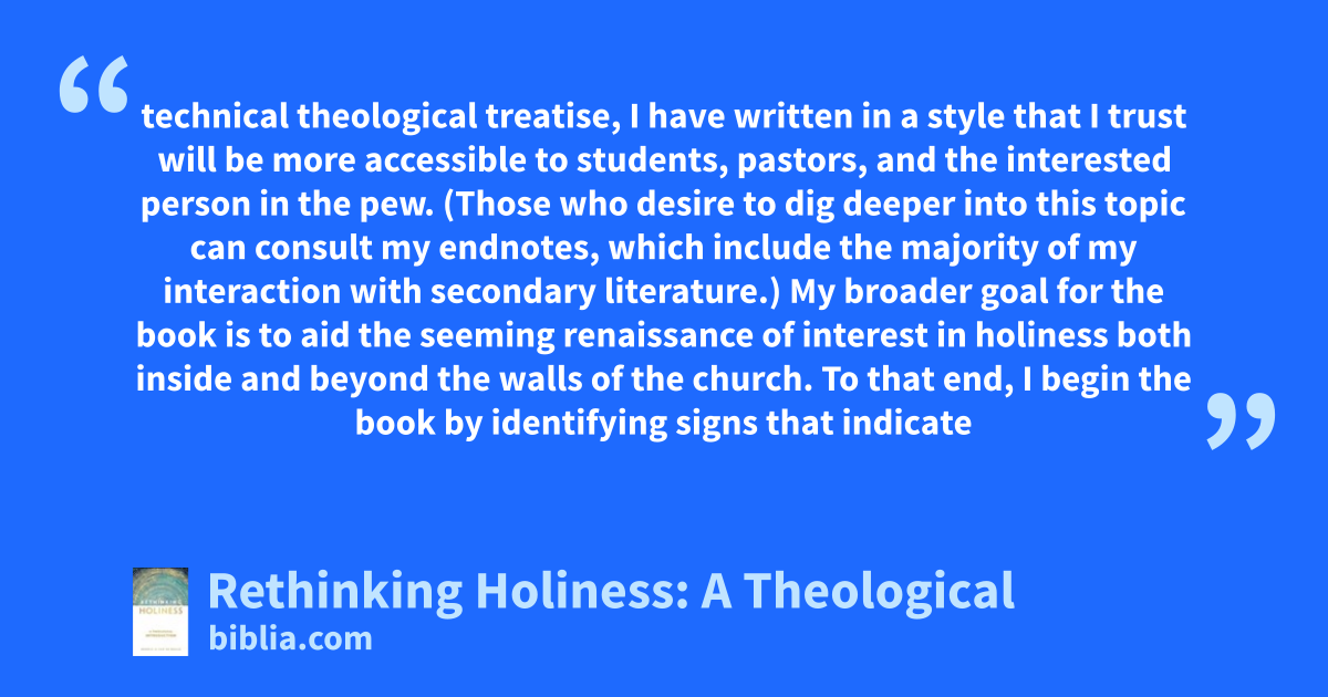 technical theological treatise, I have written in a style that I trust will be more accessible to students, pastors, and the interested person in the pew. (Those who desire to dig deeper into this topic can consult my endnotes, which include the majority of my interaction with secondary literature.) My broader goal for the book is to aid the seeming renaissance of interest in holiness both inside and beyond the walls of the church. To that end, I begin the book by identifying signs that indicate
