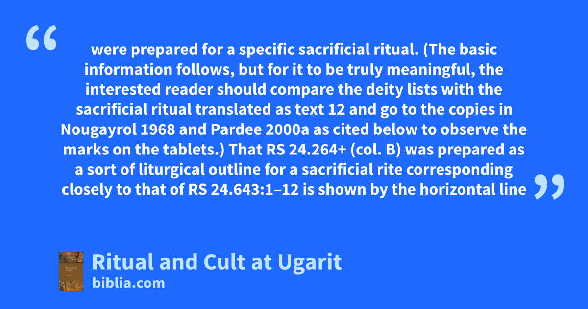 The Ugaritic ritual texts provide the only extensive documentary data for Late Bronze cultic practice in the greater Syro-Palestinian region. These texts, in a West-Semitic language that belongs to the same family as Hebrew and Aramaic, reflect the actual practice of a sacrificial cult in the city of Ugarit in the late twelfth–early eleventh centuries BCE. Based on new collations of the tablets,...