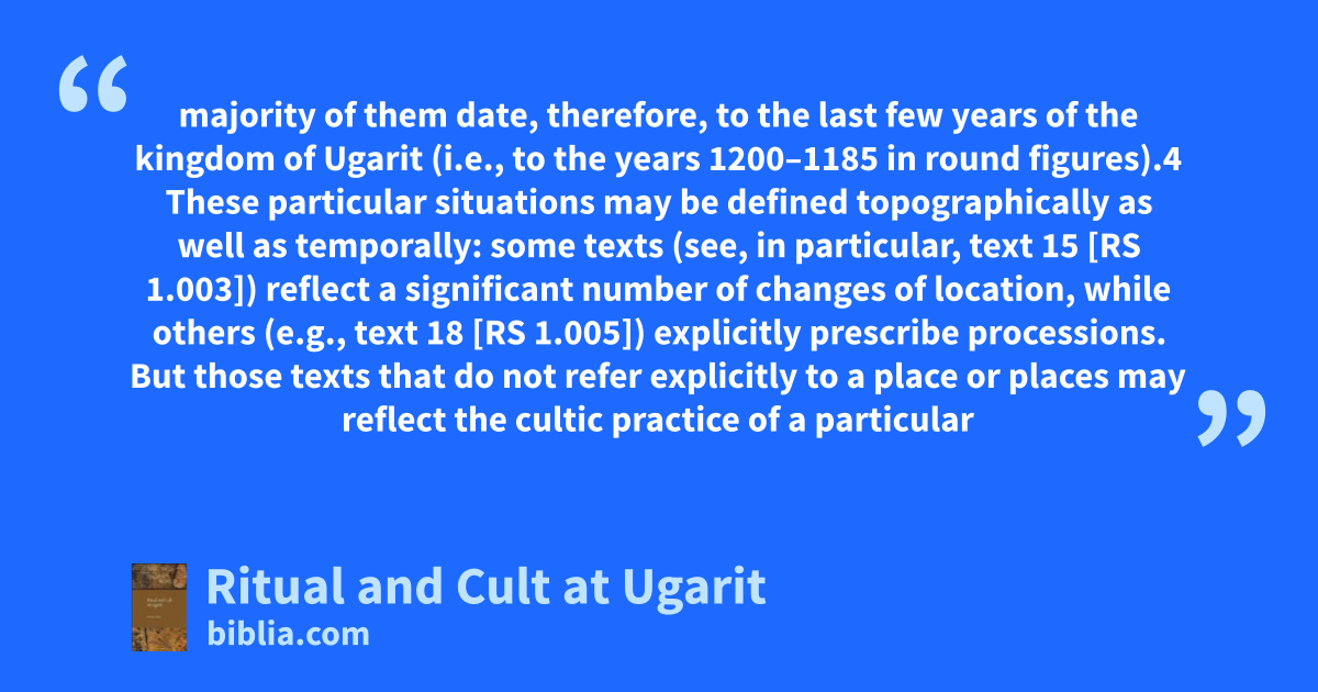 majority of them date, therefore, to the last few years of the kingdom of Ugarit (i.e., to the years 1200–1185 in round figures).4 These particular situations may be defined topographically as well as temporally: some texts (see, in particular, text 15 [RS 1.003]) reflect a significant number of changes of location, while others (e.g., text 18 [RS 1.005]) explicitly prescribe processions. But those texts that do not refer explicitly to a place or places may reflect the cultic practice of a particular