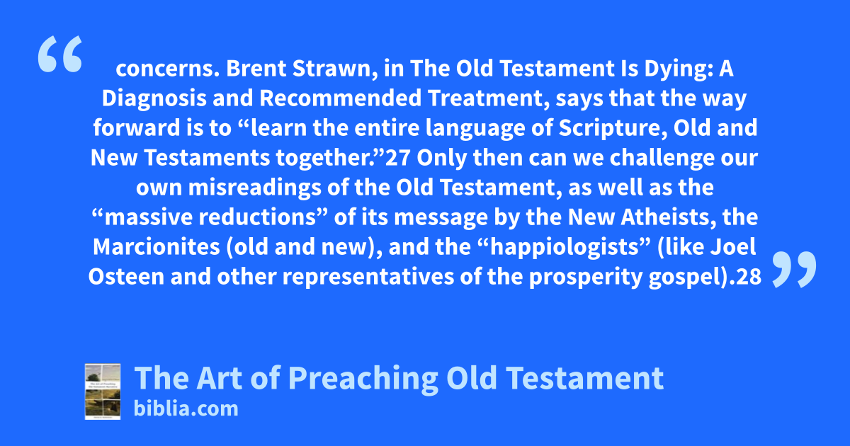 concerns. Brent Strawn, in The Old Testament Is Dying: A Diagnosis and Recommended Treatment, says that the way forward is to “learn the entire language of Scripture, Old and New Testaments together.”27 Only then can we challenge our own misreadings of the Old Testament, as well as the “massive reductions” of its message by the New Atheists, the Marcionites (old and new), and the “happiologists” (like Joel Osteen and other representatives of the prosperity gospel).28
