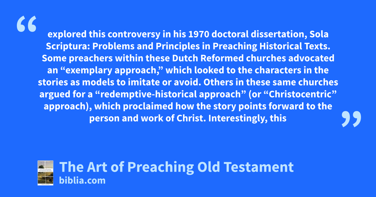 explored this controversy in his 1970 doctoral dissertation, Sola Scriptura: Problems and Principles in Preaching Historical Texts. Some preachers within these Dutch Reformed churches advocated an “exemplary approach,” which looked to the characters in the stories as models to imitate or avoid. Others in these same churches argued for a “redemptive-historical approach” (or “Christocentric” approach), which proclaimed how the story points forward to the person and work of Christ. Interestingly, this