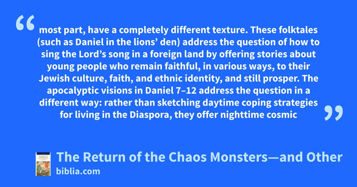 most part, have a completely different texture. These folktales (such as Daniel in the lions’ den) address the question of how to sing the Lord’s song in a foreign land by offering stories about young people who remain faithful, in various ways, to their Jewish culture, faith, and ethnic identity, and still prosper. The apocalyptic visions in Daniel 7–12 address the question in a different way: rather than sketching daytime coping strategies for living in the Diaspora, they offer nighttime cosmic