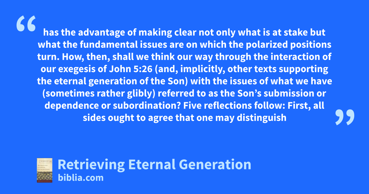 has the advantage of making clear not only what is at stake but what the fundamental issues are on which the polarized positions turn. How, then, shall we think our way through the interaction of our exegesis of John 5:26 (and, implicitly, other texts supporting the eternal generation of the Son) with the issues of what we have (sometimes rather glibly) referred to as the Son’s submission or dependence or subordination? Five reflections follow: First, all sides ought to agree that one may distinguish