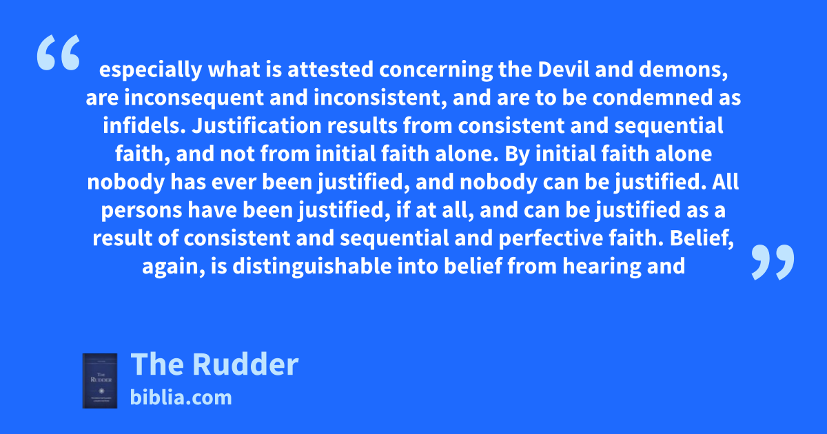 especially what is attested concerning the Devil and demons, are inconsequent and inconsistent, and are to be condemned as infidels. Justification results from consistent and sequential faith, and not from initial faith alone. By initial faith alone nobody has ever been justified, and nobody can be justified. All persons have been justified, if at all, and can be justified as a result of consistent and sequential and perfective faith. Belief, again, is distinguishable into belief from hearing and