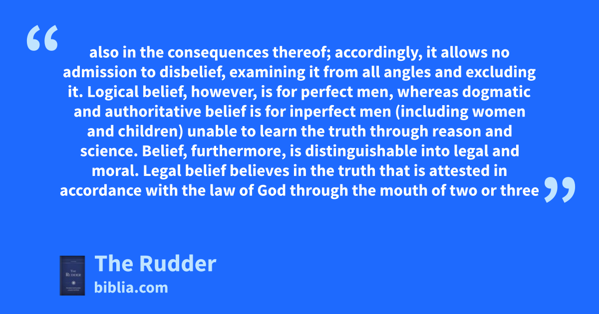 also in the consequences thereof; accordingly, it allows no admission to disbelief, examining it from all angles and excluding it. Logical belief, however, is for perfect men, whereas dogmatic and authoritative belief is for inperfect men (including women and children) unable to learn the truth through reason and science. Belief, furthermore, is distinguishable into legal and moral. Legal belief believes in the truth that is attested in accordance with the law of God through the mouth of two or three