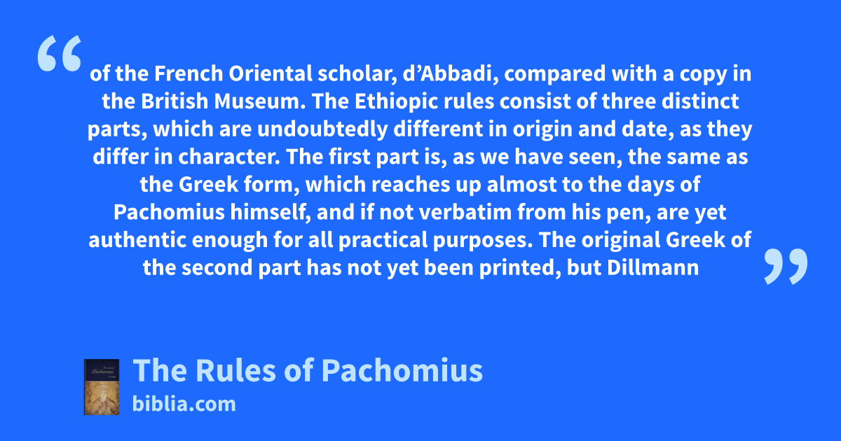 of the French Oriental scholar, d’Abbadi, compared with a copy in the British Museum. The Ethiopic rules consist of three distinct parts, which are undoubtedly different in origin and date, as they differ in character. The first part is, as we have seen, the same as the Greek form, which reaches up almost to the days of Pachomius himself, and if not verbatim from his pen, are yet authentic enough for all practical purposes. The original Greek of the second part has not yet been printed, but Dillmann