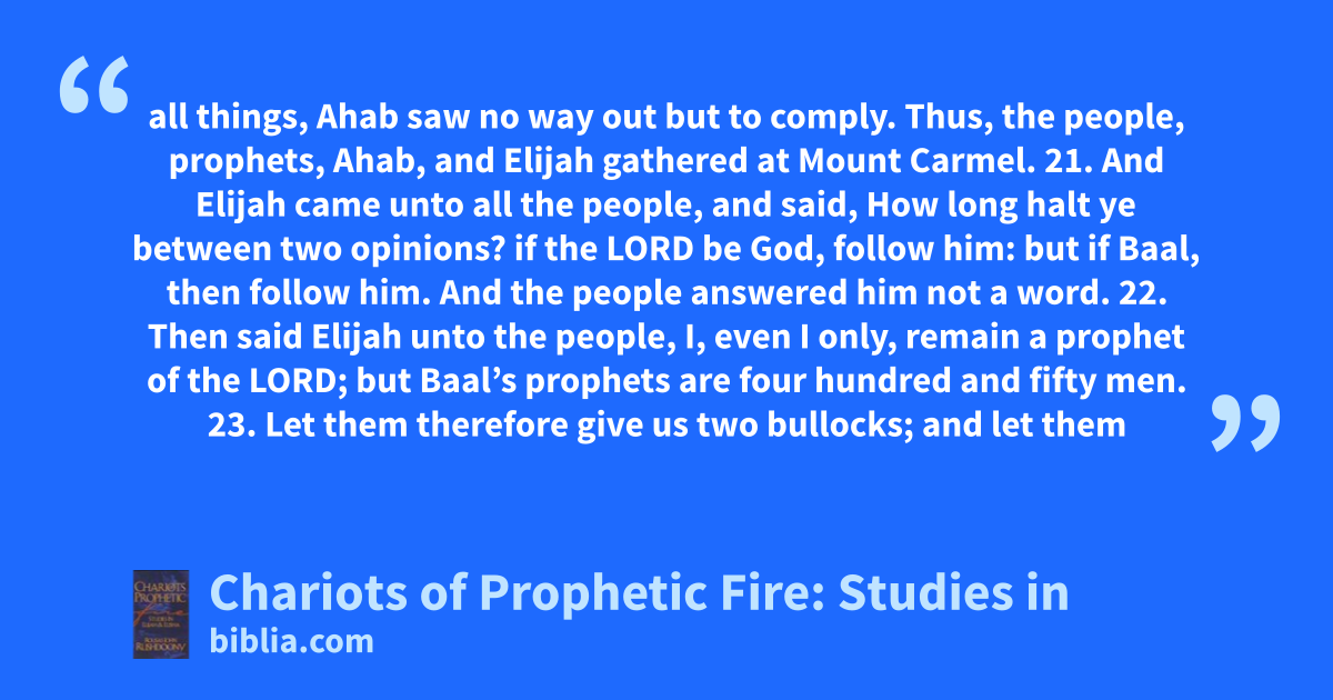 all things, Ahab saw no way out but to comply. Thus, the people, prophets, Ahab, and Elijah gathered at Mount Carmel. 21. And Elijah came unto all the people, and said, How long halt ye between two opinions? if the LORD be God, follow him: but if Baal, then follow him. And the people answered him not a word. 22. Then said Elijah unto the people, I, even I only, remain a prophet of the LORD; but Baal’s prophets are four hundred and fifty men. 23. Let them therefore give us two bullocks; and let them