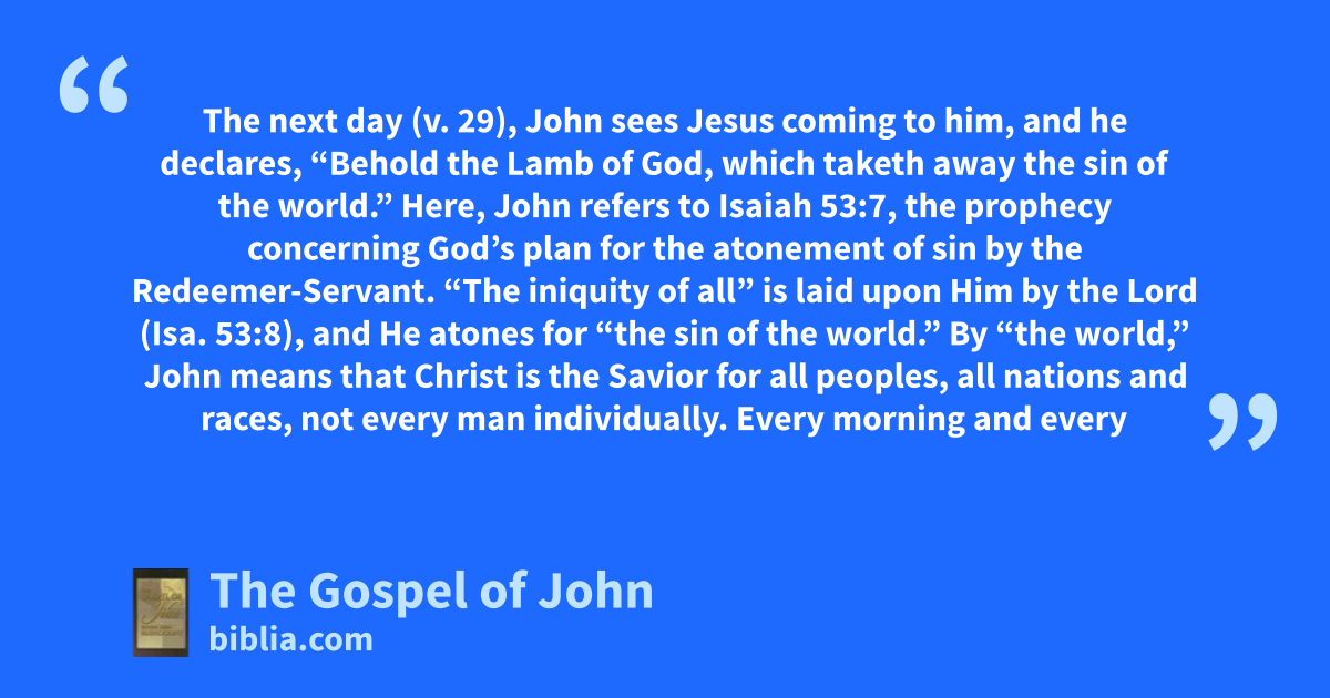 The next day (v. 29), John sees Jesus coming to him, and he declares, “Behold the Lamb of God, which taketh away the sin of the world.” Here, John refers to Isaiah 53:7, the prophecy concerning God’s plan for the atonement of sin by the Redeemer-Servant. “The iniquity of all” is laid upon Him by the Lord (Isa. 53:8), and He atones for “the sin of the world.” By “the world,” John means that Christ is the Savior for all peoples, all nations and races, not every man individually. Every morning and every
