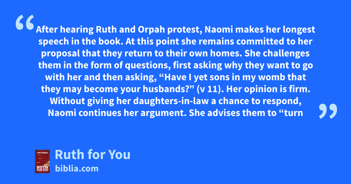 After hearing Ruth and Orpah protest, Naomi makes her longest speech in the book. At this point she remains committed to her proposal that they return to their own homes. She challenges them in the form of questions, first asking why they want to go with her and then asking, “Have I yet sons in my womb that they may become your husbands?” (v 11). Her opinion is firm. Without giving her daughters-in-law a chance to respond, Naomi continues her argument. She advises them to “turn