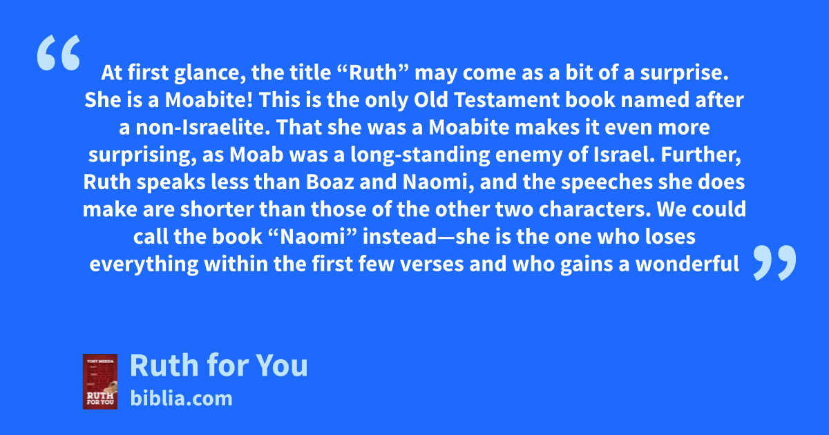 At first glance, the title “Ruth” may come as a bit of a surprise. She is a Moabite! This is the only Old Testament book named after a non-Israelite. That she was a Moabite makes it even more surprising, as Moab was a long-standing enemy of Israel. Further, Ruth speaks less than Boaz and Naomi, and the speeches she does make are shorter than those of the other two characters. We could call the book “Naomi” instead—she is the one who loses everything within the first few verses and who gains a wonderful
