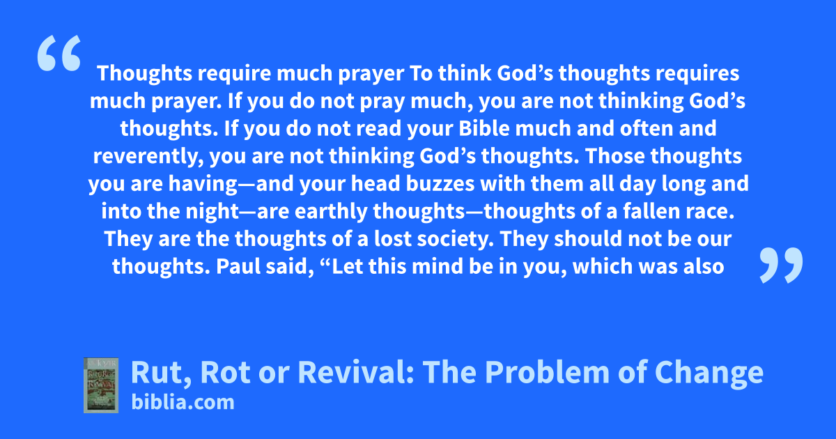 Thoughts require much prayer To think God’s thoughts requires much prayer. If you do not pray much, you are not thinking God’s thoughts. If you do not read your Bible much and often and reverently, you are not thinking God’s thoughts. Those thoughts you are having—and your head buzzes with them all day long and into the night—are earthly thoughts—thoughts of a fallen race. They are the thoughts of a lost society. They should not be our thoughts. Paul said, “Let this mind be in you, which was also