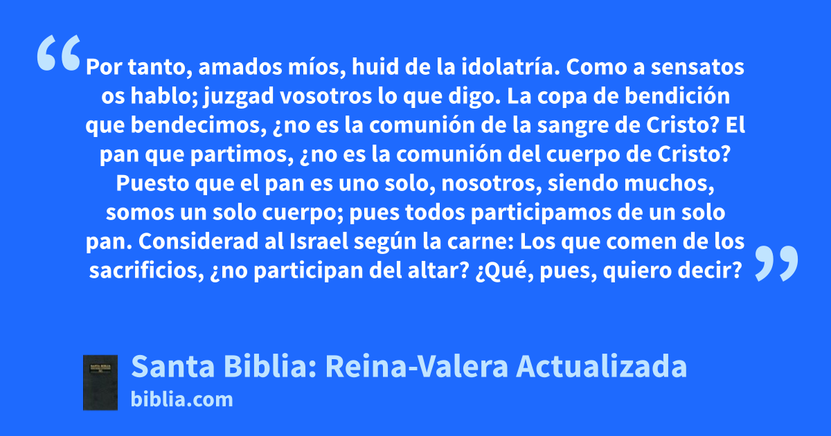 Por tanto, amados míos, huid de la idolatría. Como a sensatos os hablo; juzgad vosotros lo que digo. La copa de bendición que bendecimos, ¿no es la comunión de la sangre de Cristo? El pan que partimos, ¿no es la comunión del cuerpo de Cristo? Puesto que el pan es uno solo, nosotros, siendo muchos, somos un solo cuerpo; pues todos participamos de un solo pan. Considerad al Israel según la carne: Los que comen de los sacrificios, ¿no participan del altar? ¿Qué, pues, quiero decir?