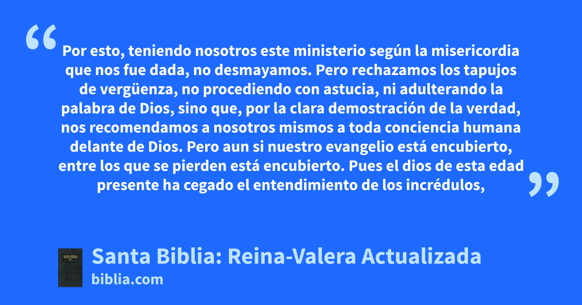 Por esto, teniendo nosotros este ministerio según la misericordia que nos fue dada, no desmayamos. Pero rechazamos los tapujos de vergüenza, no procediendo con astucia, ni adulterando la palabra de Dios, sino que, por la clara demostración de la verdad, nos recomendamos a nosotros mismos a toda conciencia humana delante de Dios. Pero aun si nuestro evangelio está encubierto, entre los que se pierden está encubierto. Pues el dios de esta edad presente ha cegado el entendimiento de los incrédulos,
