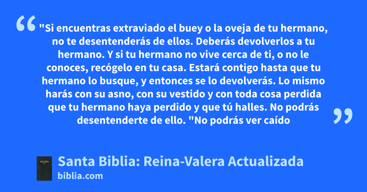 "Si encuentras extraviado el buey o la oveja de tu hermano, no te desentenderás de ellos. Deberás devolverlos a tu hermano. Y si tu hermano no vive cerca de ti, o no le conoces, recógelo en tu casa. Estará contigo hasta que tu hermano lo busque, y entonces se lo devolverás. Lo mismo harás con su asno, con su vestido y con toda cosa perdida que tu hermano haya perdido y que tú halles. No podrás desentenderte de ello. "No podrás ver caído