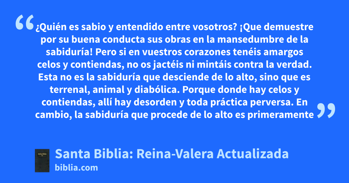 ¿Quién es sabio y entendido entre vosotros? ¡Que demuestre por su buena conducta sus obras en la mansedumbre de la sabiduría! Pero si en vuestros corazones tenéis amargos celos y contiendas, no os jactéis ni mintáis contra la verdad. Esta no es la sabiduría que desciende de lo alto, sino que es terrenal, animal y diabólica. Porque donde hay celos y contiendas, allí hay desorden y toda práctica perversa. En cambio, la sabiduría que procede de lo alto es primeramente