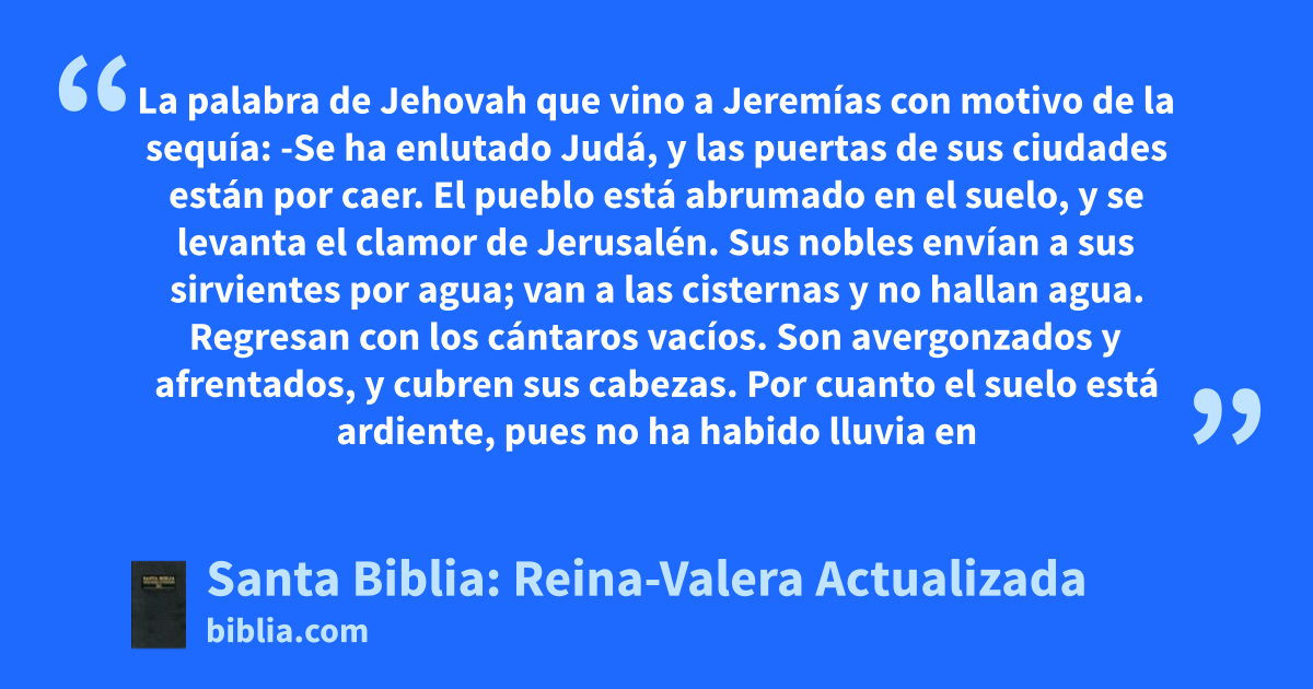 La palabra de Jehovah que vino a Jeremías con motivo de la sequía: -Se ha enlutado Judá, y las puertas de sus ciudades están por caer. El pueblo está abrumado en el suelo, y se levanta el clamor de Jerusalén. Sus nobles envían a sus sirvientes por agua; van a las cisternas y no hallan agua. Regresan con los cántaros vacíos. Son avergonzados y afrentados, y cubren sus cabezas. Por cuanto el suelo está ardiente, pues no ha habido lluvia en