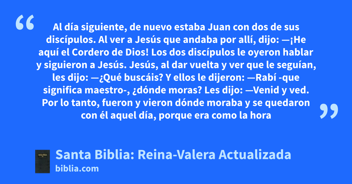 Al día siguiente, de nuevo estaba Juan con dos de sus discípulos. Al ver a Jesús que andaba por allí, dijo: —¡He aquí el Cordero de Dios! Los dos discípulos le oyeron hablar y siguieron a Jesús. Jesús, al dar vuelta y ver que le seguían, les dijo: —¿Qué buscáis? Y ellos le dijeron: —Rabí -que significa maestro-, ¿dónde moras? Les dijo: —Venid y ved. Por lo tanto, fueron y vieron dónde moraba y se quedaron con él aquel día, porque era como la hora