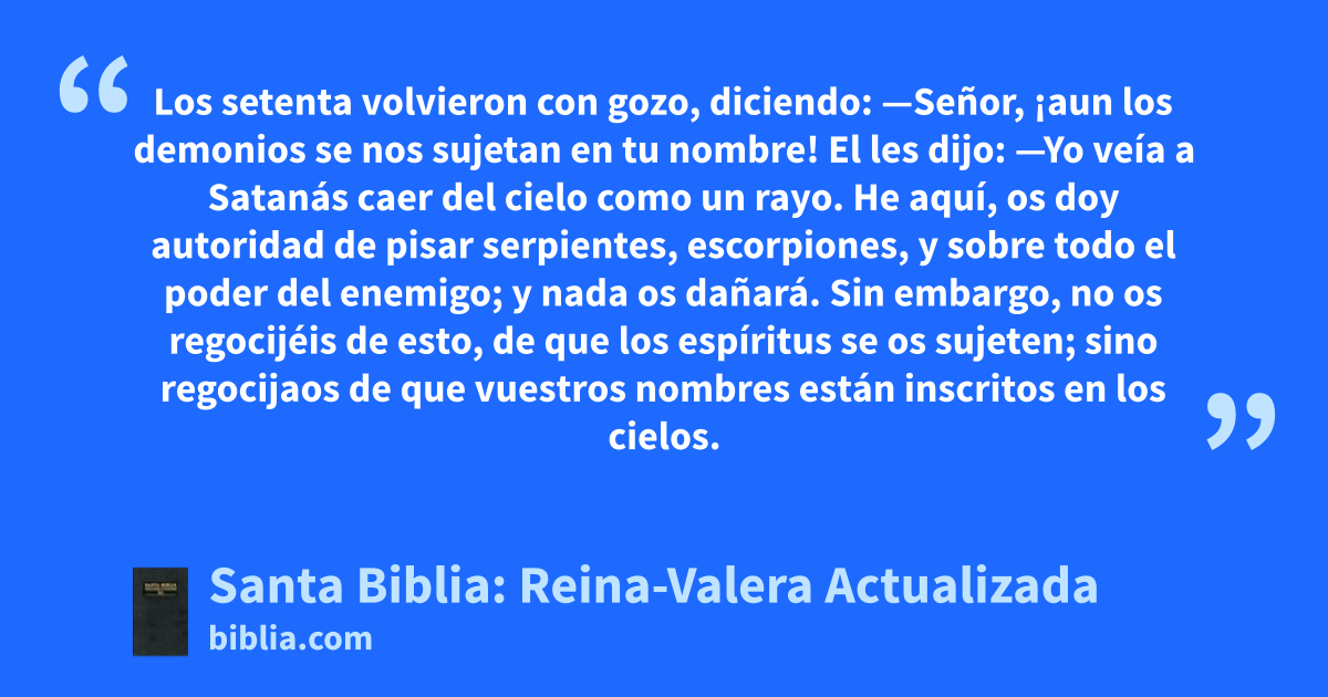 Los setenta volvieron con gozo, diciendo: —Señor, ¡aun los demonios se nos sujetan en tu nombre! El les dijo: —Yo veía a Satanás caer del cielo como un rayo. He aquí, os doy autoridad de pisar serpientes, escorpiones, y sobre todo el poder del enemigo; y nada os dañará. Sin embargo, no os regocijéis de esto, de que los espíritus se os sujeten; sino regocijaos de que vuestros nombres están inscritos en los cielos.