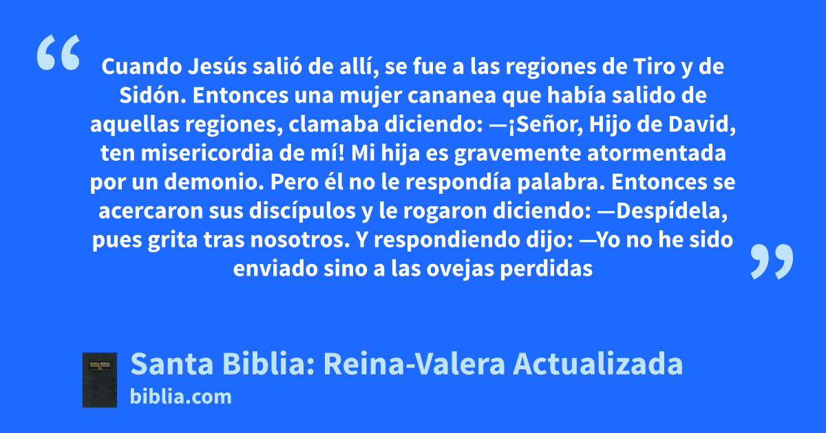Cuando Jesús salió de allí, se fue a las regiones de Tiro y de Sidón. Entonces una mujer cananea que había salido de aquellas regiones, clamaba diciendo: —¡Señor, Hijo de David, ten misericordia de mí! Mi hija es gravemente atormentada por un demonio. Pero él no le respondía palabra. Entonces se acercaron sus discípulos y le rogaron diciendo: —Despídela, pues grita tras nosotros. Y respondiendo dijo: —Yo no he sido enviado sino a las ovejas perdidas