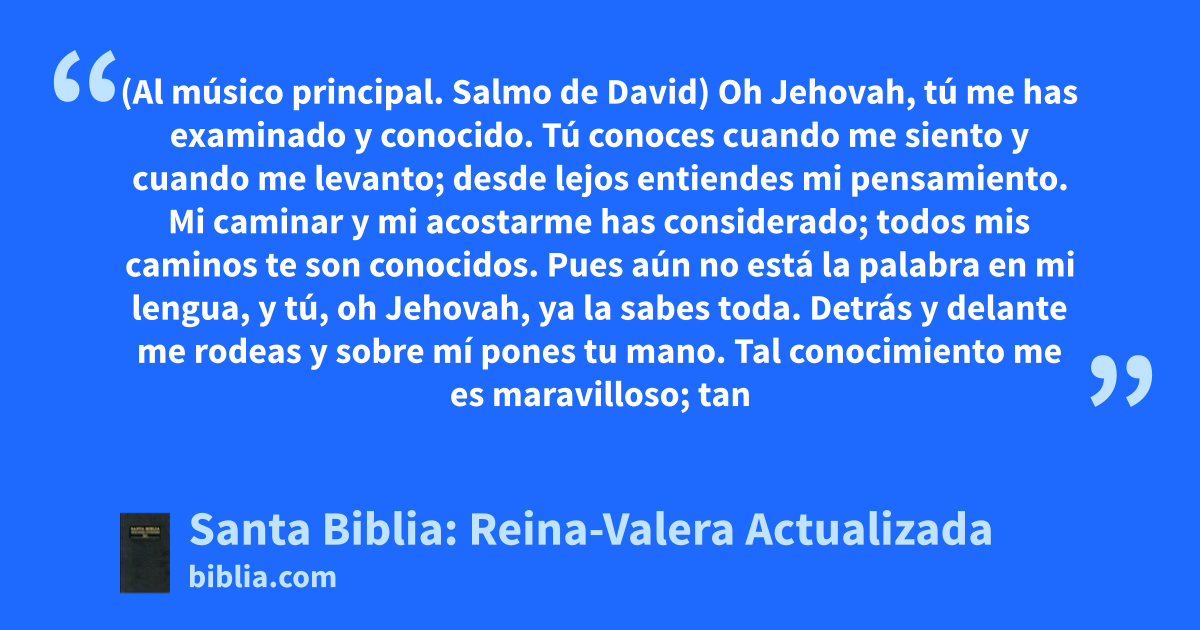 (Al músico principal. Salmo de David) Oh Jehovah, tú me has examinado y conocido. Tú conoces cuando me siento y cuando me levanto; desde lejos entiendes mi pensamiento. Mi caminar y mi acostarme has considerado; todos mis caminos te son conocidos. Pues aún no está la palabra en mi lengua, y tú, oh Jehovah, ya la sabes toda. Detrás y delante me rodeas y sobre mí pones tu mano. Tal conocimiento me es maravilloso; tan