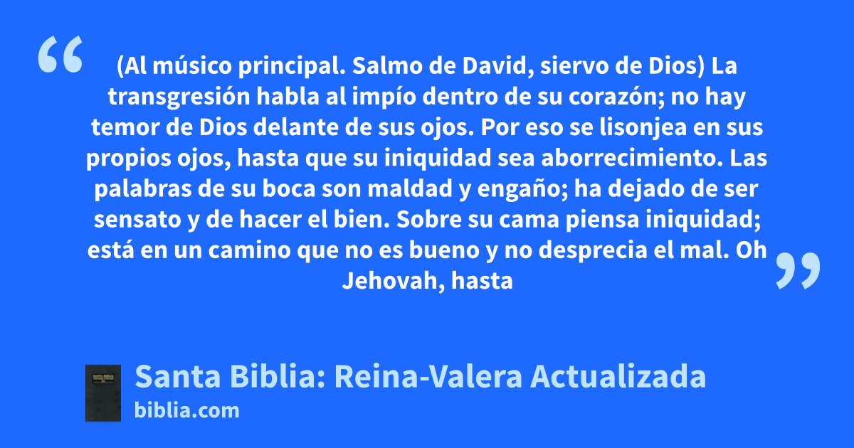 (Al músico principal. Salmo de David, siervo de Dios) La transgresión habla al impío dentro de su corazón; no hay temor de Dios delante de sus ojos. Por eso se lisonjea en sus propios ojos, hasta que su iniquidad sea aborrecimiento. Las palabras de su boca son maldad y engaño; ha dejado de ser sensato y de hacer el bien. Sobre su cama piensa iniquidad; está en un camino que no es bueno y no desprecia el mal. Oh Jehovah, hasta