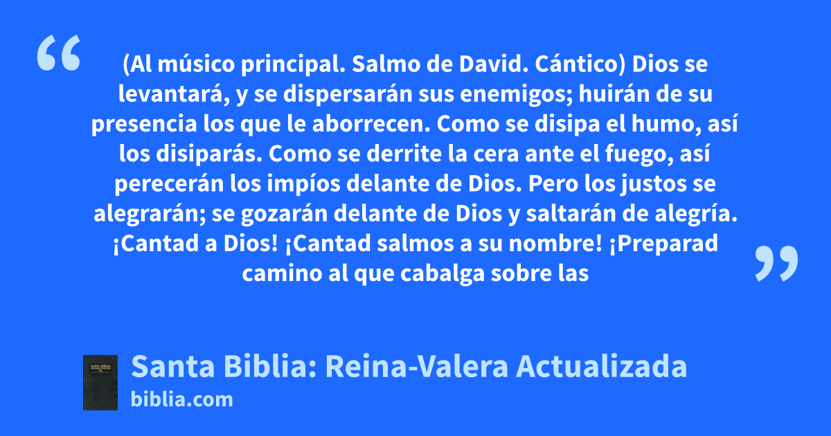 (Al músico principal. Salmo de David. Cántico) Dios se levantará, y se dispersarán sus enemigos; huirán de su presencia los que le aborrecen. Como se disipa el humo, así los disiparás. Como se derrite la cera ante el fuego, así perecerán los impíos delante de Dios. Pero los justos se alegrarán; se gozarán delante de Dios y saltarán de alegría. ¡Cantad a Dios! ¡Cantad salmos a su nombre! ¡Preparad camino al que cabalga sobre las