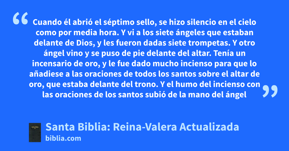 Cuando él abrió el séptimo sello, se hizo silencio en el cielo como por media hora. Y vi a los siete ángeles que estaban delante de Dios, y les fueron dadas siete trompetas. Y otro ángel vino y se puso de pie delante del altar. Tenía un incensario de oro, y le fue dado mucho incienso para que lo añadiese a las oraciones de todos los santos sobre el altar de oro, que estaba delante del trono. Y el humo del incienso con las oraciones de los santos subió de la mano del ángel
