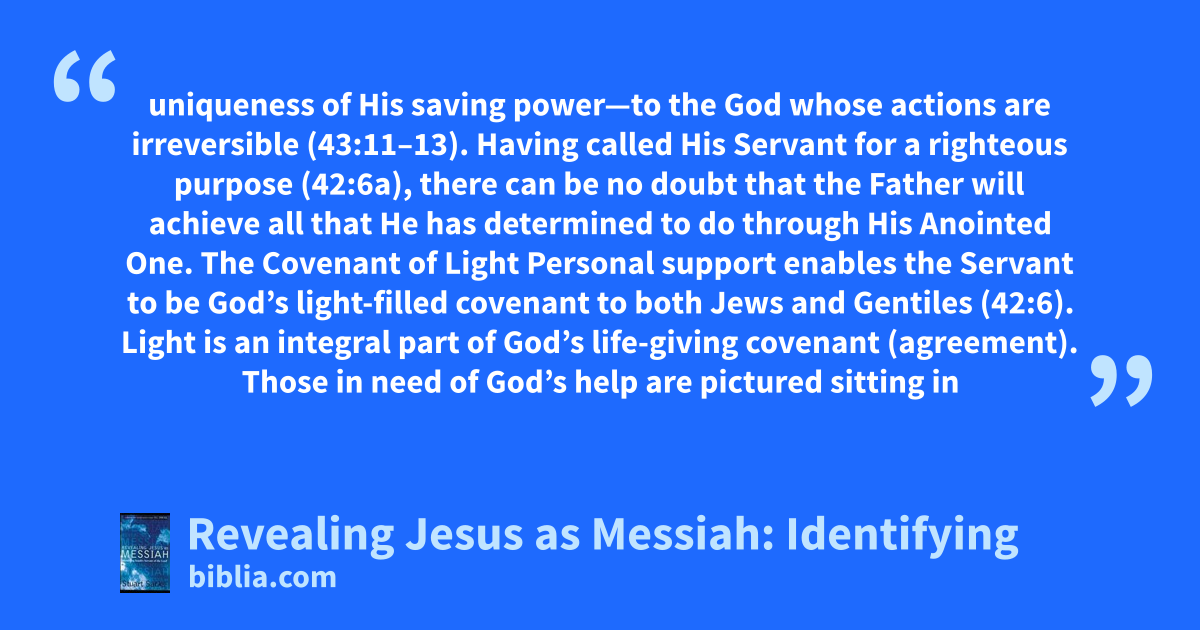 uniqueness of His saving power—to the God whose actions are irreversible (43:11–13). Having called His Servant for a righteous purpose (42:6a), there can be no doubt that the Father will achieve all that He has determined to do through His Anointed One. The Covenant of Light Personal support enables the Servant to be God’s light-filled covenant to both Jews and Gentiles (42:6). Light is an integral part of God’s life-giving covenant (agreement). Those in need of God’s help are pictured sitting in