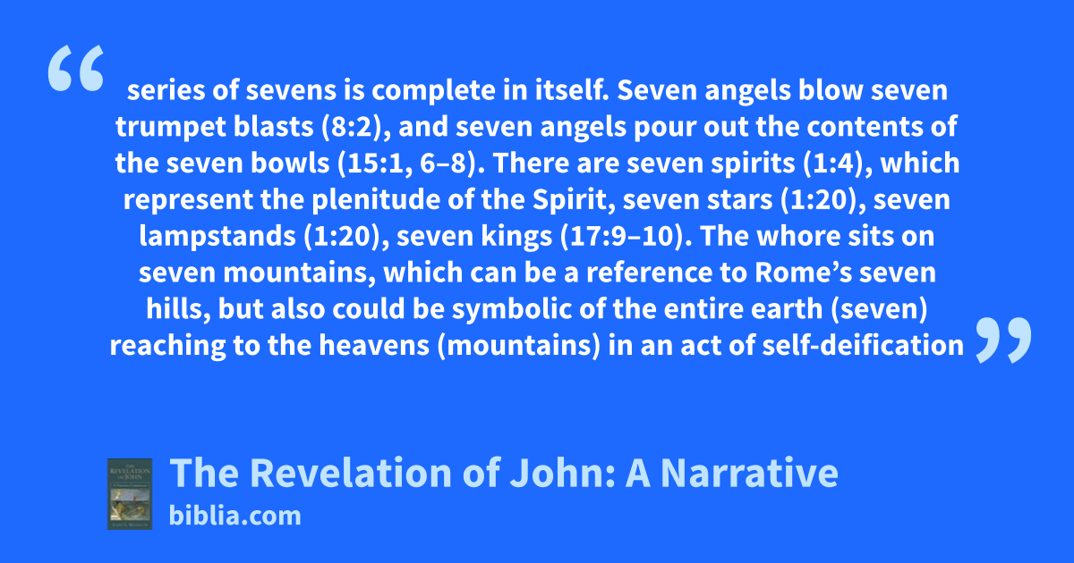 series of sevens is complete in itself. Seven angels blow seven trumpet blasts (8:2), and seven angels pour out the contents of the seven bowls (15:1, 6–8). There are seven spirits (1:4), which represent the plenitude of the Spirit, seven stars (1:20), seven lampstands (1:20), seven kings (17:9–10). The whore sits on seven mountains, which can be a reference to Rome’s seven hills, but also could be symbolic of the entire earth (seven) reaching to the heavens (mountains) in an act of self-deification