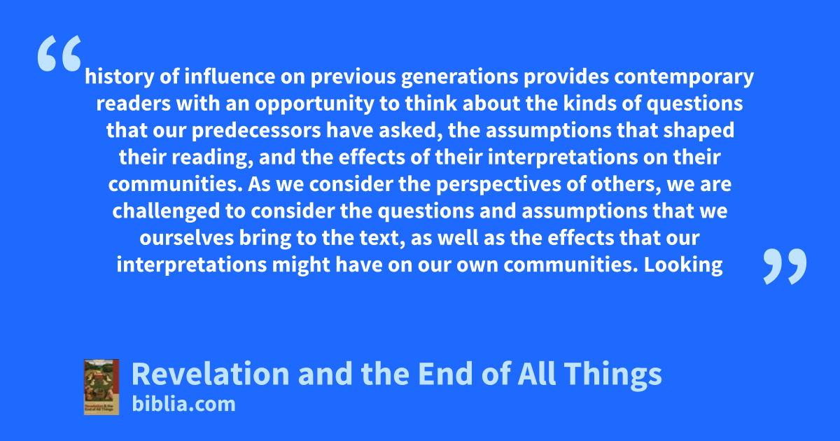 history of influence on previous generations provides contemporary readers with an opportunity to think about the kinds of questions that our predecessors have asked, the assumptions that shaped their reading, and the effects of their interpretations on their communities. As we consider the perspectives of others, we are challenged to consider the questions and assumptions that we ourselves bring to the text, as well as the effects that our interpretations might have on our own communities. Looking