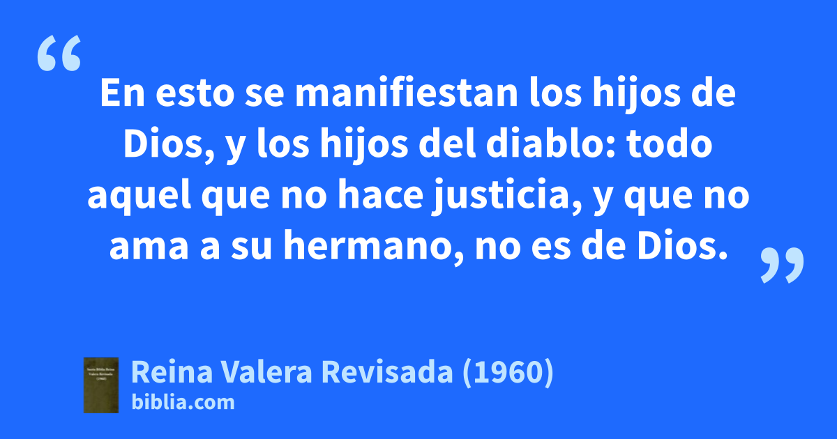 4Todo aquel que comete pecado, infringe también la ley; pues el pecado es infracción de la ley. 5Y sabéis que él apareció para quitar nuestros pecados,b y no hay pecado en él. 6Todo aquel que permanece en él, no peca; todo aquel que peca, no le ha visto, ni le ha conocido. 7Hijitos, nadie os engañe; el que hace justicia es justo, como él es justo. 8El que practica el pecado es del diablo; porque el diablo peca desde el principio. Para esto apareció el Hijo de Dios, para deshacer las obras del diablo. 9Todo aquel que es nacido de Dios, no practica el pecado, porque la simiente de Dios permanece en él; y no puede pecar, porque es nacido de Dios. 10En esto se manifiestan los hijos de Dios, y los hijos del diablo: todo aquel que no hace justicia, y que no ama a su hermano, no es de Dios.