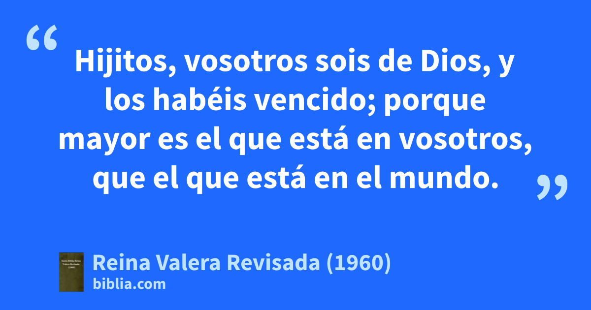 1Amados, no creáis a todo espíritu, sino probad los espíritus si son de Dios; porque muchos falsos profetas han salido por el mundo. 2En esto conoced el Espíritu de Dios: Todo espíritu que confiesa que Jesucristo ha venido en carne, es de Dios; 3y todo espíritu que no confiesa que Jesucristo ha venido en carne, no es de Dios; y este es el espíritu del anticristo, el cual vosotros habéis oído que viene, y que ahora ya está en el mundo. 4Hijitos, vosotros sois de Dios, y los habéis vencido; porque mayor es el que está en vosotros, que el que está en el mundo. 5Ellos son del mundo; por eso hablan del mundo, y el mundo los oye. 6Nosotros somos de Dios; el que conoce a Dios, nos oye; el que no es de Dios, no nos oye. En esto conocemos el espíritu de verdad y el espíritu de error.