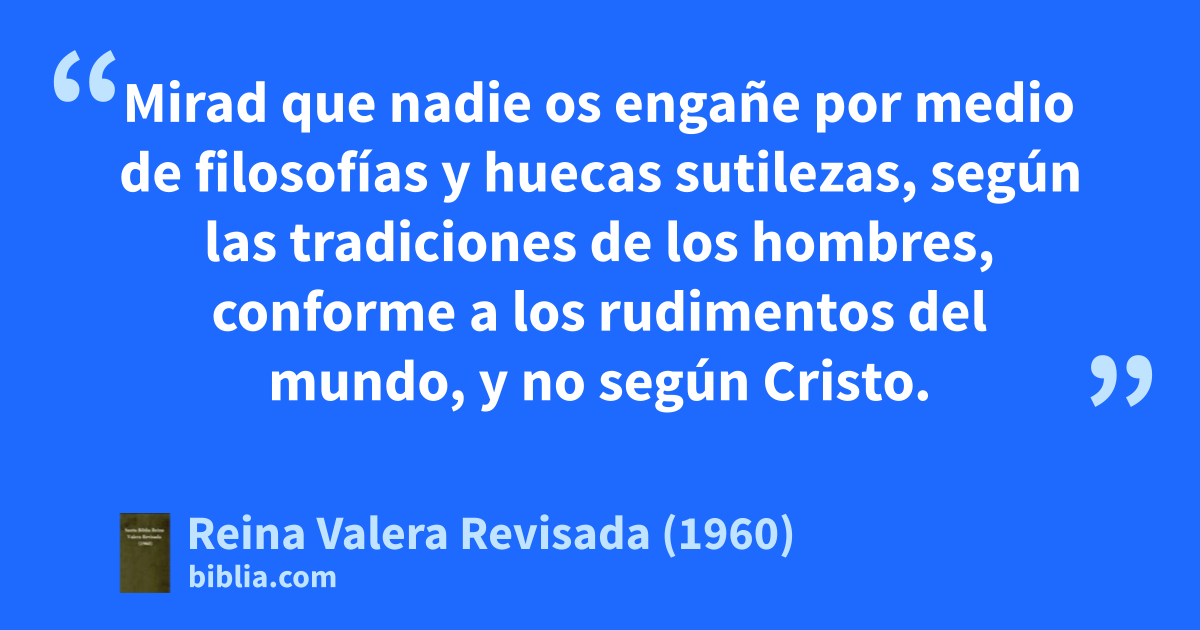 8Mirad que nadie os engañe por medio de filosofías y huecas sutilezas, según las tradiciones de los hombres, conforme a los rudimentos del mundo, y no según Cristo. 9Porque en él habita corporalmente toda la plenitud de la Deidad, 10y vosotros estáis completos en él, que es la cabeza de todo principado y potestad. 11En él también fuisteis circuncidados con circuncisión no hecha a mano, al echar de vosotros el cuerpo pecaminoso carnal, en la circuncisión de Cristo; 12sepultados con él en el bautismo, en el cual fuisteis también resucitados con él, mediante la fe en el poder de Dios que le levantó de los muertos.a 13Y a vosotros, estando muertos en pecados y en la incircuncisión de vuestra carne, os dio vida juntamente con él,b perdonándoos todos los pecados, 14anulando el acta de los decretos que había contra nosotros, que nos era contraria, quitándola de en medio y clavándola en la cruz,c 15y despojando a los principados y a las potestades, los exhibió públicamente, triunfando sobre ellos en la cruz.