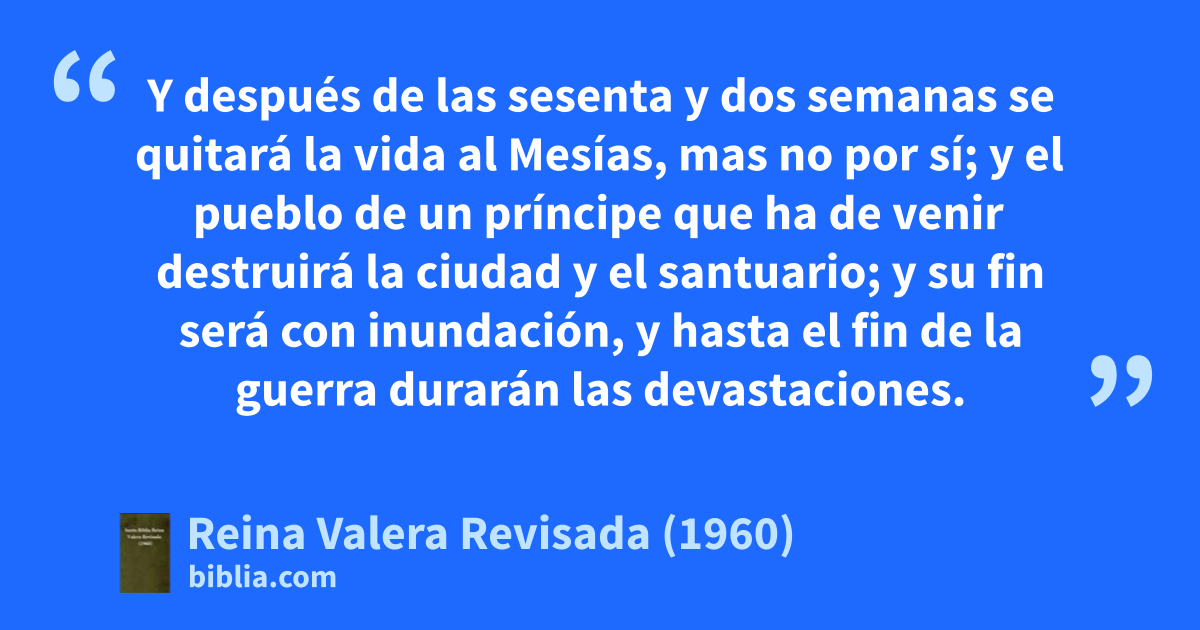 24Setenta semanas están determinadas sobre tu pueblo y sobre tu santa ciudad, para terminar la prevaricación, y poner fin al pecado, y expiar la iniquidad, para traer la justicia perdurable, y sellar la visión y la profecía, y ungir al Santo de los santos. 25Sabe, pues, y entiende, que desde la salida de la orden para restaurar y edificar a Jerusalén hasta el Mesías Príncipe, habrá siete semanas, y sesenta y dos semanas; se volverá a edificar la plaza y el muro en tiempos angustiosos. 26Y después de las sesenta y dos semanas se quitará la vida al Mesías, mas no por sí; y el pueblo de un príncipe que ha de venir destruirá la ciudad y el santuario; y su fin será con inundación, y hasta el fin de la guerra durarán las devastaciones. 27Y por otra semana confirmará el pacto con muchos; a la mitad de la semana hará cesar el sacrificio y la ofrenda. Después con la muchedumbre de las abominaciones vendrá el desolador,c hasta que venga la consumación, y lo que está determinado se derrame sobre el desolador.