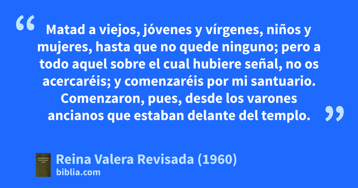 3Y la gloria del Dios de Israel se elevó de encima del querubín, sobre el cual había estado, al umbral de la casa; y llamó Jehová al varón vestido de lino, que tenía a su cintura el tintero de escribano, 4y le dijo Jehová: Pasa por en medio de la ciudad, por en medio de Jerusalén, y ponles una señal en la frentea a los hombres que gimen y que claman a causa de todas las abominaciones que se hacen en medio de ella. 5Y a los otros dijo, oyéndolo yo: Pasad por la ciudad en pos de él, y matad; no perdone vuestro ojo, ni tengáis misericordia. 6Matad a viejos, jóvenes y vírgenes, niños y mujeres, hasta que no quede ninguno; pero a todo aquel sobre el cual hubiere señal, no os acercaréis; y comenzaréis por mi santuario. Comenzaron, pues, desde los varones ancianos que estaban delante del templo. 7Y les dijo: Contaminad la casa, y llenad los atrios de muertos; salid. Y salieron, y mataron en la ciudad. 8Aconteció que cuando ellos iban matando y quedé yo solo, me postré sobre mi rostro, y clamé y dije: ¡Ah, Señor Jehová! ¿destruirás a todo el remanente de Israel derramando tu furor sobre Jerusalén?