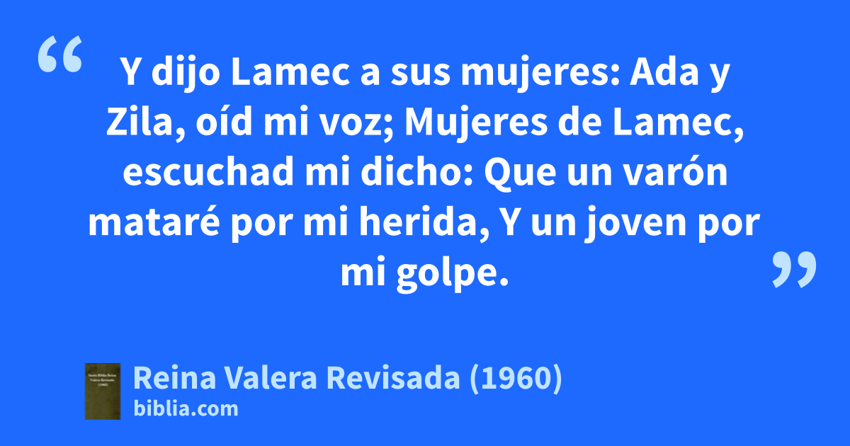 16Salió, pues, Caín de delante de Jehová, y habitó en tierra de Nod,7 al oriente de Edén. 17Y conoció Caín a su mujer, la cual concibió y dio a luz a Enoc; y edificó una ciudad, y llamó el nombre de la ciudad del nombre de su hijo, Enoc. 18Y a Enoc le nació Irad, e Irad engendró a Mehujael, y Mehujael engendró a Metusael, y Metusael engendró a Lamec. 19Y Lamec tomó para sí dos mujeres; el nombre de la una fue Ada, y el nombre de la otra, Zila. 20Y Ada dio a luz a Jabal, el cual fue padre de los que habitan en tiendas y crían ganados. 21Y el nombre de su hermano fue Jubal, el cual fue padre de todos los que tocan arpa y flauta. 22Y Zila también dio a luz a Tubal-caín, artífice de toda obra de bronce y de hierro; y la hermana de Tubal-caín fue Naama.