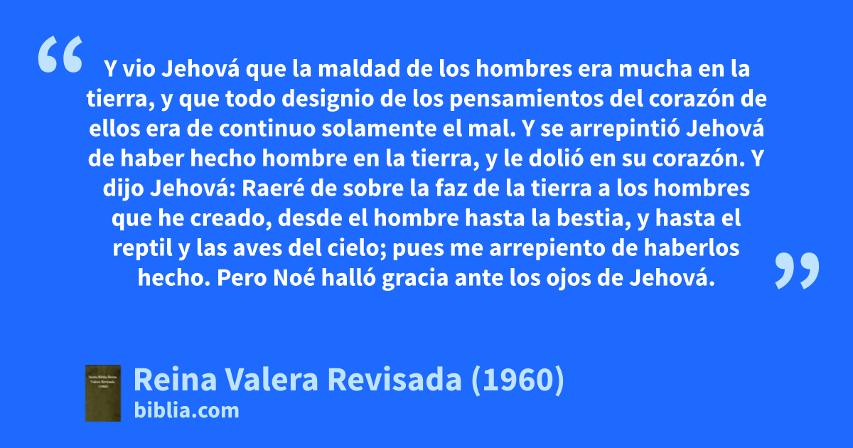 5Y vio Jehová que la maldad de los hombres era mucha en la tierra, y que todo designio de los pensamientos del corazón de ellos era de continuo solamente el mal. 6Y se arrepintió Jehová de haber hecho hombre en la tierra, y le dolió en su corazón. 7Y dijo Jehová: Raeré de sobre la faz de la tierra a los hombres que he creado, desde el hombre hasta la bestia, y hasta el reptil y las aves del cielo; pues me arrepiento de haberlos hecho. 8Pero Noé halló gracia ante los ojos de Jehová.b