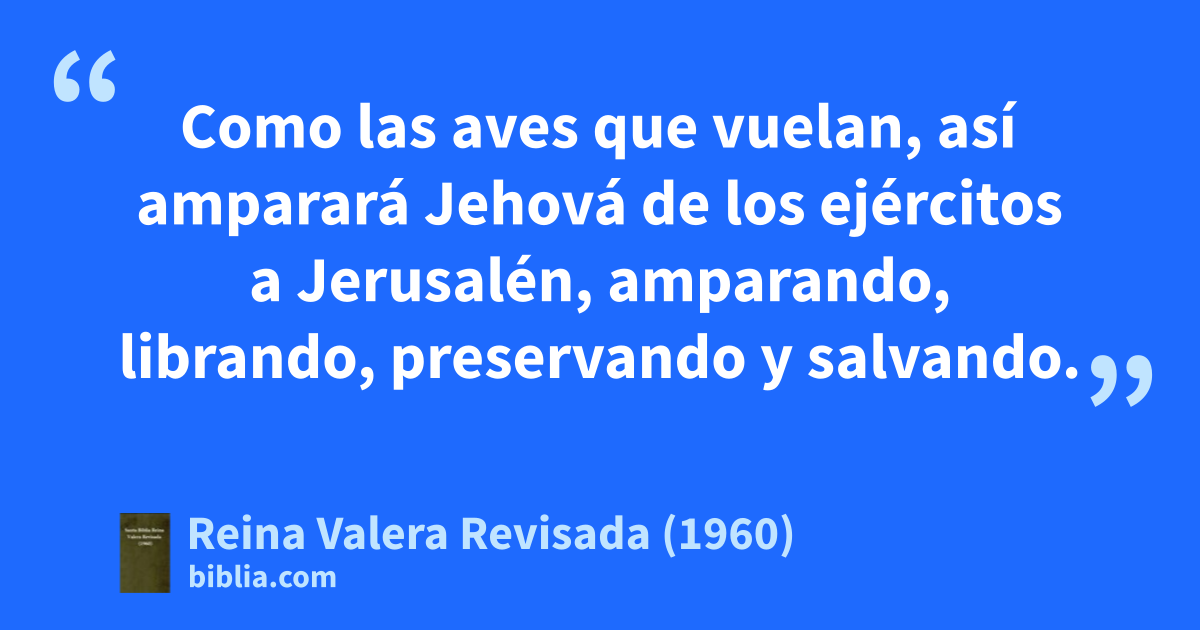 4Porque Jehová me dijo a mí de esta manera: Como el león y el cachorro de león ruge sobre la presa, y si se reúne cuadrilla de pastores contra él, no lo espantarán sus voces, ni se acobardará por el tropel de ellos; así Jehová de los ejércitos descenderá a pelear sobre el monte de Sion, y sobre su collado. 5Como las aves que vuelan, así amparará Jehová de los ejércitos a Jerusalén, amparando, librando, preservando y salvando.