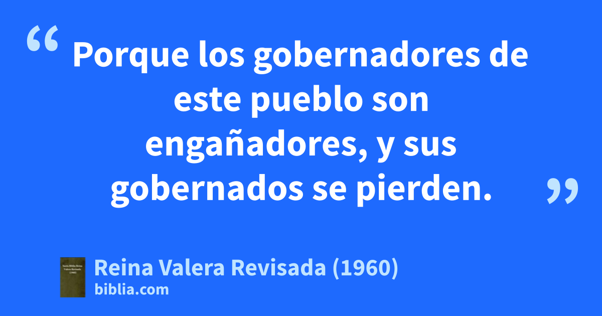 13Pero el pueblo no se convirtió al que lo castigaba, ni buscó a Jehová de los ejércitos. 14Y Jehová cortará de Israel cabeza y cola, rama y caña en un mismo día. 15El anciano y venerable de rostro es la cabeza; el profeta que enseña mentira, es la cola. 16Porque los gobernadores de este pueblo son engañadores, y sus gobernados se pierden. 17Por tanto, el Señor no tomará contentamiento en sus jóvenes, ni de sus huérfanos y viudas tendrá misericordia; porque todos son falsos y malignos, y toda boca habla despropósitos. Ni con todo esto ha cesado su furor, sino que todavía su mano está extendida.