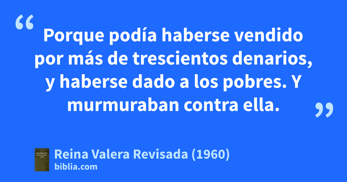 3Pero estando él en Betania, en casa de Simón el leproso, y sentado a la mesa, vino una mujer con un vaso de alabastro de perfume de nardo puro de mucho precio; y quebrando el vaso de alabastro, se lo derramó sobre su cabeza.b 4Y hubo algunos que se enojaron dentro de sí, y dijeron: ¿Para qué se ha hecho este desperdicio de perfume? 5Porque podía haberse vendido por más de trescientos denarios, y haberse dado a los pobres. Y murmuraban contra ella. 6Pero Jesús dijo: Dejadla, ¿por qué la molestáis? Buena obra me ha hecho. 7Siempre tendréis a los pobres con vosotros,c y cuando queráis les podréis hacer bien; pero a mí no siempre me tendréis. 8Esta ha hecho lo que podía; porque se ha anticipado a ungir mi cuerpo para la sepultura. 9De cierto os digo que dondequiera que se predique este evangelio, en todo el mundo, también se contará lo que ésta ha hecho, para memoria de ella.