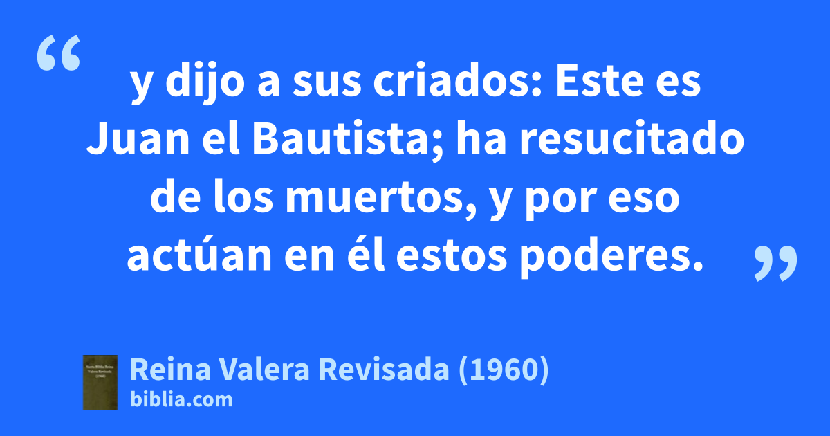 1En aquel tiempo Herodes el tetrarca oyó la fama de Jesús, 2y dijo a sus criados: Este es Juan el Bautista; ha resucitado de los muertos, y por eso actúan en él estos poderes. 3Porque Herodes había prendido a Juan, y le había encadenado y metido en la cárcel, por causa de Herodías, mujer de Felipe su hermano; 4porque Juan le decía: No te es lícito tenerla.a,b 5Y Herodes quería matarle, pero temía al pueblo; porque tenían a Juan por profeta. 6Pero cuando se celebraba el cumpleaños de Herodes, la hija de Herodías danzó en medio, y agradó a Herodes, 7por lo cual éste le prometió con juramento darle todo lo que pidiese. 8Ella, instruida primero por su madre, dijo: Dame aquí en un plato la cabeza de Juan el Bautista. 9Entonces el rey se entristeció; pero a causa del juramento, y de los que estaban con él a la mesa, mandó que se la diesen, 10y ordenó decapitar a Juan en la cárcel. 11Y fue traída su cabeza en un plato, y dada a la muchacha; y ella la presentó a su madre. 12Entonces llegaron sus discípulos, y tomaron el cuerpo y lo enterraron; y fueron y dieron las nuevas a Jesús.