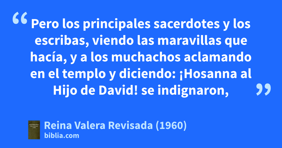14Y vinieron a él en el templo ciegos y cojos, y los sanó. 15Pero los principales sacerdotes y los escribas, viendo las maravillas que hacía, y a los muchachos aclamando en el templo y diciendo: ¡Hosanna al Hijo de David! se indignaron, 16y le dijeron: ¿Oyes lo que éstos dicen? Y Jesús les dijo: Sí; ¿nunca leísteis: