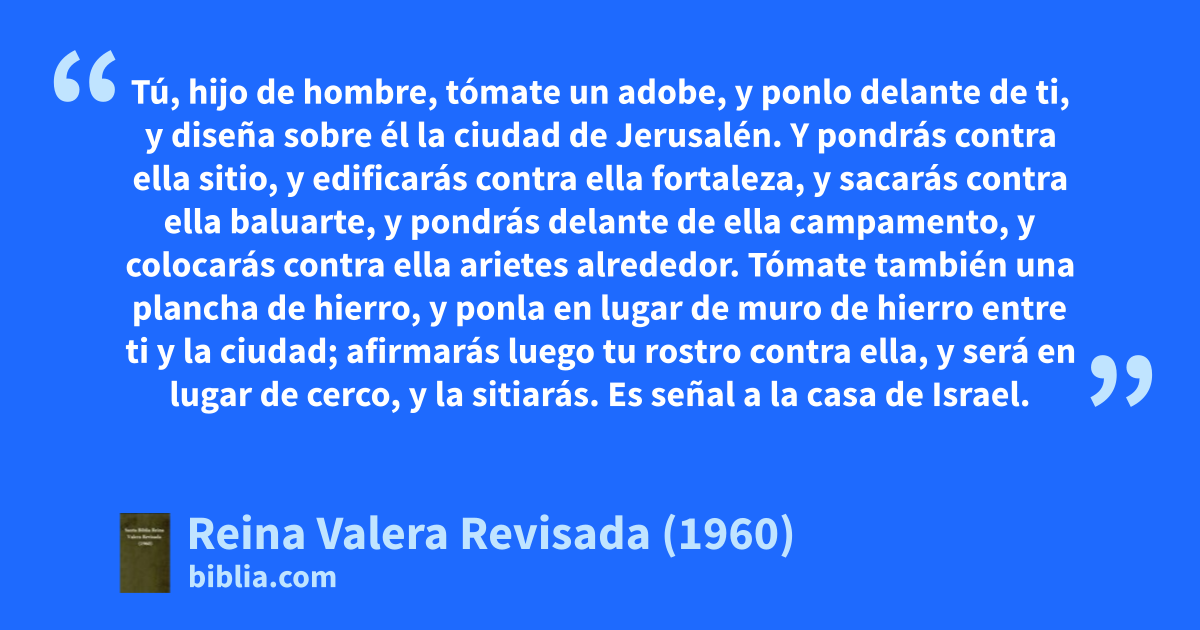 1Tú, hijo de hombre, tómate un adobe, y ponlo delante de ti, y diseña sobre él la ciudad de Jerusalén. 2Y pondrás contra ella sitio, y edificarás contra ella fortaleza, y sacarás contra ella baluarte, y pondrás delante de ella campamento, y colocarás contra ella arietes alrededor. 3Tómate también una plancha de hierro, y ponla en lugar de muro de hierro entre ti y la ciudad; afirmarás luego tu rostro contra ella, y será en lugar de cerco, y la sitiarás. Es señal a la casa de Israel.