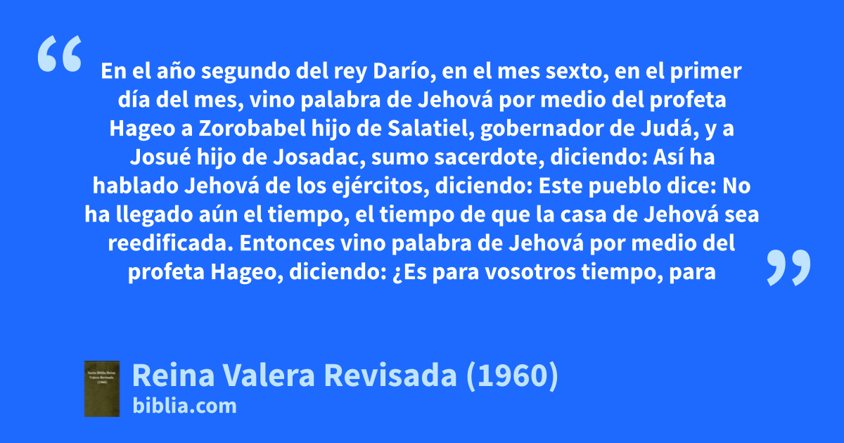 1En el año segundo del rey Darío, en el mes sexto, en el primer día del mes, vino palabra de Jehová por medio del profeta Hageoa a Zorobabel hijo de Salatiel, gobernador de Judá, y a Josué hijo de Josadac, sumo sacerdote, diciendo: 2Así ha hablado Jehová de los ejércitos, diciendo: Este pueblo dice: No ha llegado aún el tiempo, el tiempo de que la casa de Jehová sea reedificada. 3Entonces vino palabra de Jehová por medio del profeta Hageo, diciendo: 4¿Es para vosotros tiempo, para vosotros, de habitar en vuestras casas artesonadas, y esta casa está desierta? 5Pues así ha dicho Jehová de los ejércitos: Meditad bien sobre vuestros caminos. 6Sembráis mucho, y recogéis poco; coméis, y no os saciáis; bebéis, y no quedáis satisfechos; os vestís, y no os calentáis; y el que trabaja a jornal recibe su jornal en saco roto.