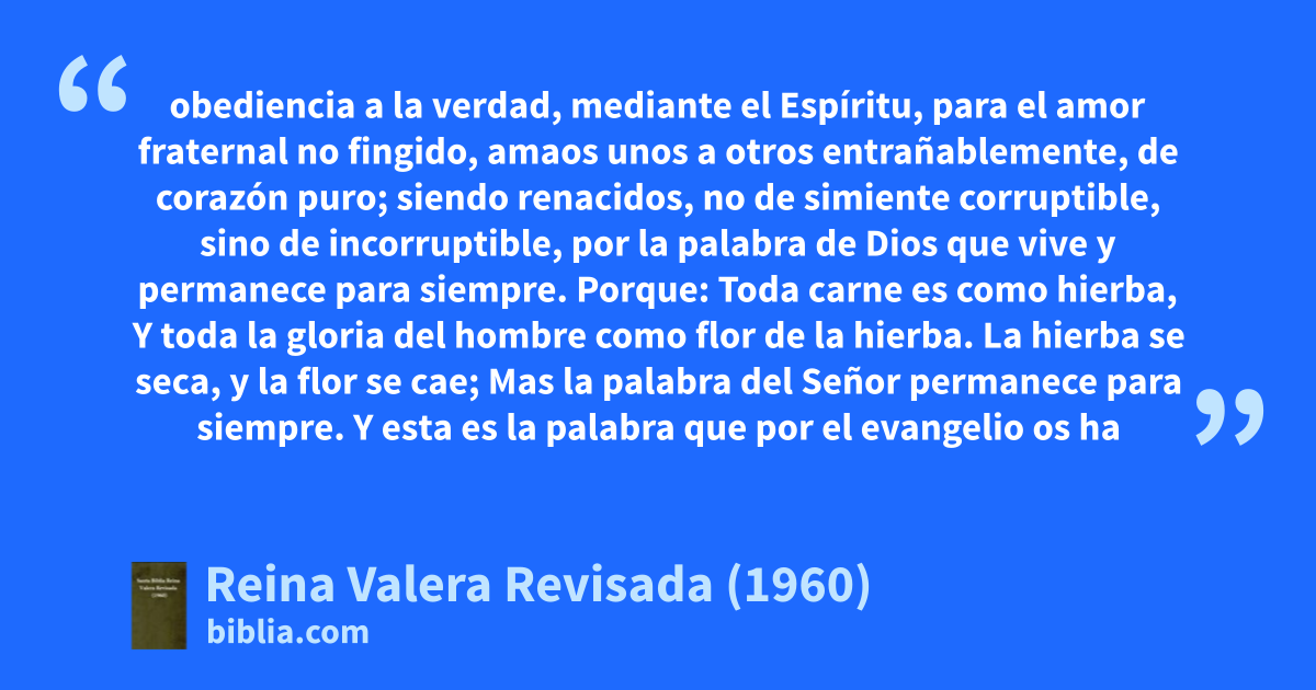 22Habiendo purificado vuestras almas por la obediencia a la verdad, mediante el Espíritu, para el amor fraternal no fingido, amaos unos a otros entrañablemente, de corazón puro; 23siendo renacidos, no de simiente corruptible, sino de incorruptible, por la palabra de Dios que vive y permanece para siempre. 24Porque: