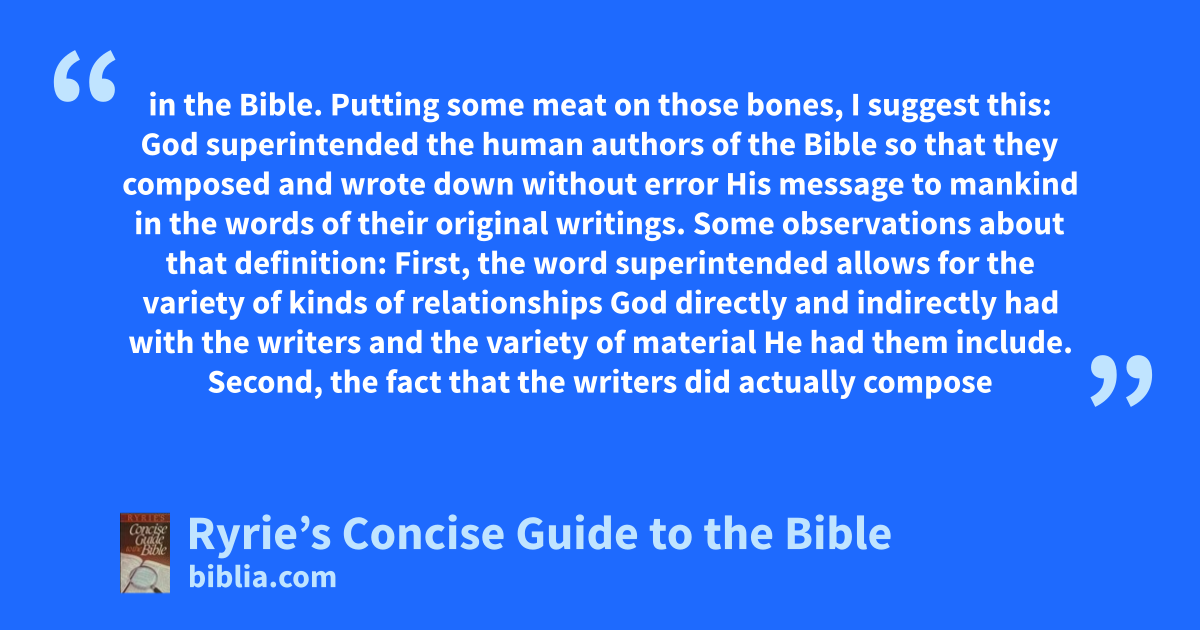 in the Bible. Putting some meat on those bones, I suggest this: God superintended the human authors of the Bible so that they composed and wrote down without error His message to mankind in the words of their original writings. Some observations about that definition: First, the word superintended allows for the variety of kinds of relationships God directly and indirectly had with the writers and the variety of material He had them include. Second, the fact that the writers did actually compose