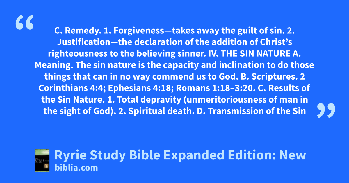 C. Remedy. 1. Forgiveness—takes away the guilt of sin. 2. Justification—the declaration of the addition of Christ’s righteousness to the believing sinner. IV. THE SIN NATURE A. Meaning. The sin nature is the capacity and inclination to do those things that can in no way commend us to God. B. Scriptures. 2 Corinthians 4:4; Ephesians 4:18; Romans 1:18–3:20. C. Results of the Sin Nature. 1. Total depravity (unmeritoriousness of man in the sight of God). 2. Spiritual death. D. Transmission of the Sin